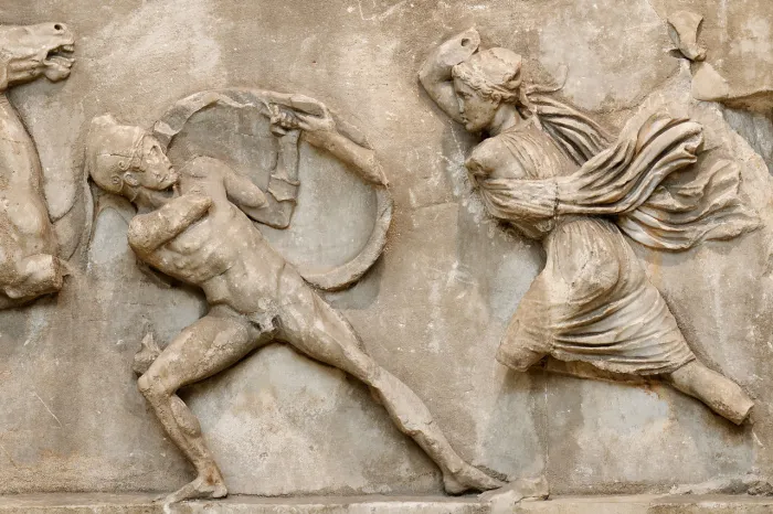 고대 그리스의 도시인 할리카르나소스에 세워진 '마우솔레움(mausoleum)'의 프리즈에는 그리스인들과 아마존인들이 싸우는 장면의 부조가 조각되어있다. 그리스 신화에 소아시아 근처에 살았던 여전사들과 그리스와의 전쟁 이야기가 나오는데 이들의 이야기는 그리스 미술의 초창기였던 기원전 7세기부터 헬레니즘 시대에 이르기까지 예술가들의 상상력을 자극하며 작품에 반영되었다. 이 작품의 조각가인 스코파스(Scopas)는 충동적이며 거세게 휘몰아치는 듯한 동작을 표현하였는데, 이는 파르테논 신전의 조각상에서 볼 수 있는 조화와는 거리가 멀며 오히려 이전 시대의 고졸 양식과 비슷하다. 그의 자유로운 방식은 등을 돌리고 말을 타는 모습과 같은 자세의 과감하며 혁신적인 조각을 만들어내었다.