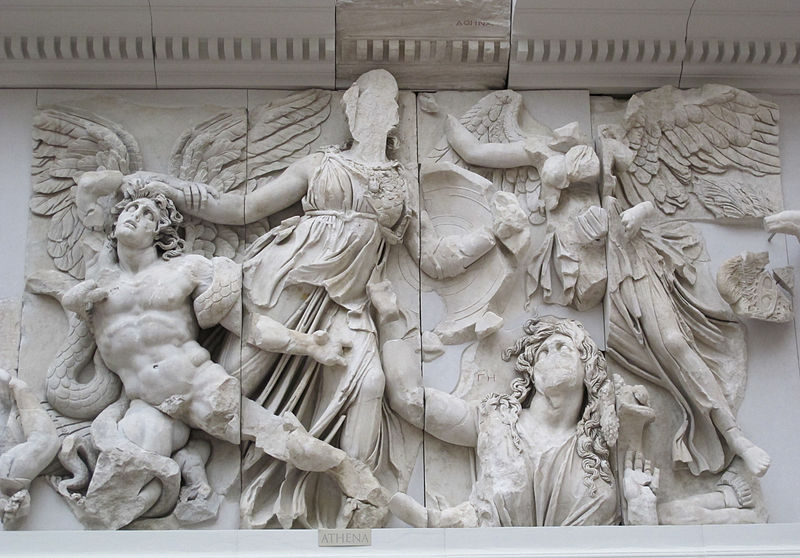 페르가몬을 내려다보는 언덕 위에 축조된 새로운 제단의 프리즈 부분에 설치한 <아테나와 알키오네우스> 부조에는 신들과 거인들이 싸우는 장면을 묘사하고 있다. 비록 여신의 얼굴이 손상되어 있지만 적의 머리를 움켜쥐고 있는 당당한 자태는 숨겨지지 않는다. 이런 방식의 조각은 이오니아 양식의 신전 프리즈에서 흔히 볼 수 있는 장식이다. 이 부조의 인물들은 매우 깊게 새겨졌으며 마치 튀어나올 것 같은 인상을 준다. 박공의 틀에 구속되지 않는 듯 역동적인 힘을 발산하는 조각의 몸체는 육중한 부피감을 보이고 있다. 이런 서로 다른 양식이 결합한 형태는 그리스 건축 조각이 발전 단계에서 최고 절정의 과정에 이르렀음을 의미한다.