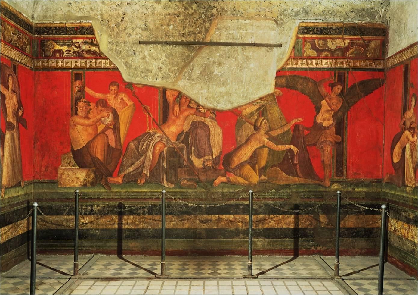폼페이 외곽에서 발굴된 또 다른 저택에도 대형 벽화가 그려져 있다. '신비의 저택'이라 명한 이곳에는 장대한 구성과 일관된 양식을 가진 작품이 있는데 녹색의 난간 위에 인물을 배치하고 검은색의 띠와 같이 생긴 기둥으로 각 장면들을 구분하였다. 배경에는 붉은색으로 채웠는데 이런 구성은 그림에 신비감을 부여한다. 이 그림들에 묘사된 수많은 사람들이 누구이며 무엇을 하는지 정확한 자료는 없다. 그러나 추측했을 때 이들은 디오니소스 밀교를 숭배하는 것으로 보인다. 이 종교는 그리스에서부터 시작하여 전파된 아주 오래된 비밀 종교였는데 이 교리에 의하면 인간과 영적 세계는 하나로 융합되어야 하며 또한 추종자들이 이런 상태가 되는 것을 추구한다. 이 정보를 가지고 그림을 다시 확인해보면 이들이 숭배 의식이나 행사에 몰입하여 심취해 있는 모습이 보인다. 등장인물들의 자세는 그리스 미술의 고전 시대의 영향을 받은 것 같지만 표정이나 분위기는 고전주의와 거리가 멀며 오히려 독특한 생동감을 가지고 있다.