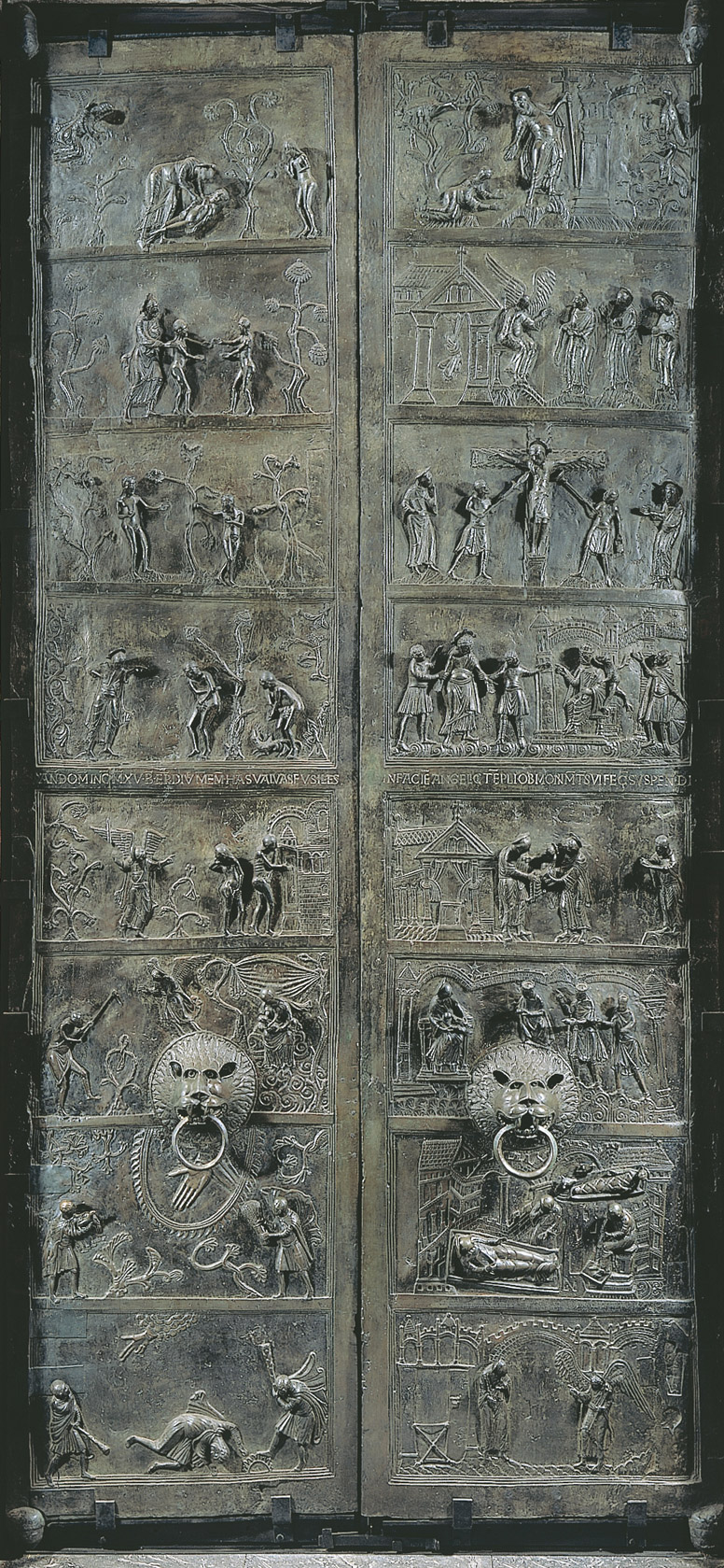 <힐데스하임 성당>에는 베른바르트가 특별 주문한 청동 문이 설치되어있다. 문의 표면은 수평방향으로 공간이 분할되어 있는데 각 공간에는 성경의 내용을 고부조 방식으로 새겨놓았다. 문의 왼편에는 창세기를 오른편에는 그리스도의 생애를 기록하였다. 이 청동 문의 부조의 전체적인 구성은 수사본의 형식을 그대로 가져온 것으로 보인다. 묘사된 인물은 실제 인물의 키보다 훨씬 작게 처리되어 있으며 꿈틀거리는 듯한 식물의 형태는 아일랜드의 세밀화를 연상시킨다. 원죄를 지은 아담과 이브의 모습 부조 아래에는 로마체 문장이 상감기법으로 새겨져 있는데 베른바르트의 이름과 부조의 완성 날짜가 기록되어 있다. 각 공간의 장면들은 글자로 된 설명 없이도 성경의 이야기가 바로 연상될 정도로 실감 나게 묘사되어 있으며 이는 글을 모르는 사람들에게 말씀을 전하는 역할도 하였다.