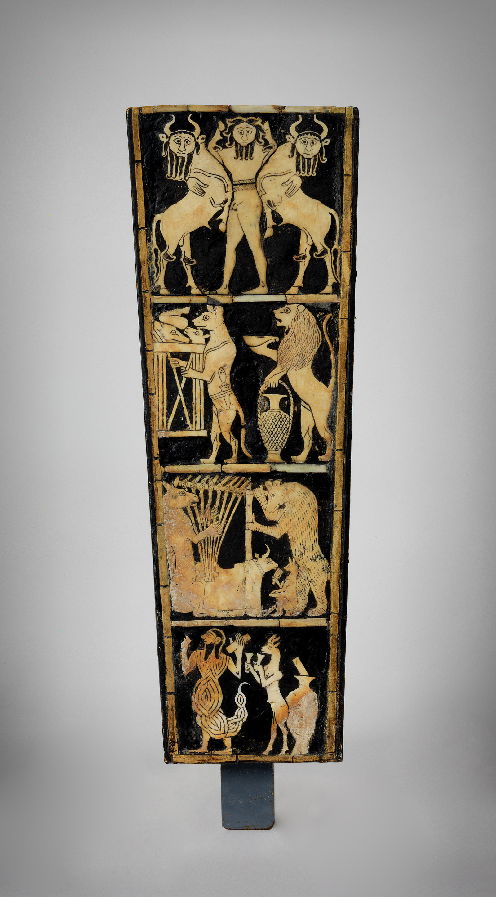 현대인의 눈에는 이런 장면들이 마냥 재미있고 익살스러운 것으로 여겨진다. 이 패널의 등장인물들에게 부여된 역할이나 이야기를 확인할 수 있다면 진정한 가치를 알 수 있을지도 모른다. 이 <하프의 공명 통에 부착된 상감 패널>은 동물 우화의 역사에 있어서는 가장 최초의 형태로 평가된다. 특히 하프를 연주하는 나귀는 중세시대의 조각에서도 보게 될 요소로 남게 되었다.